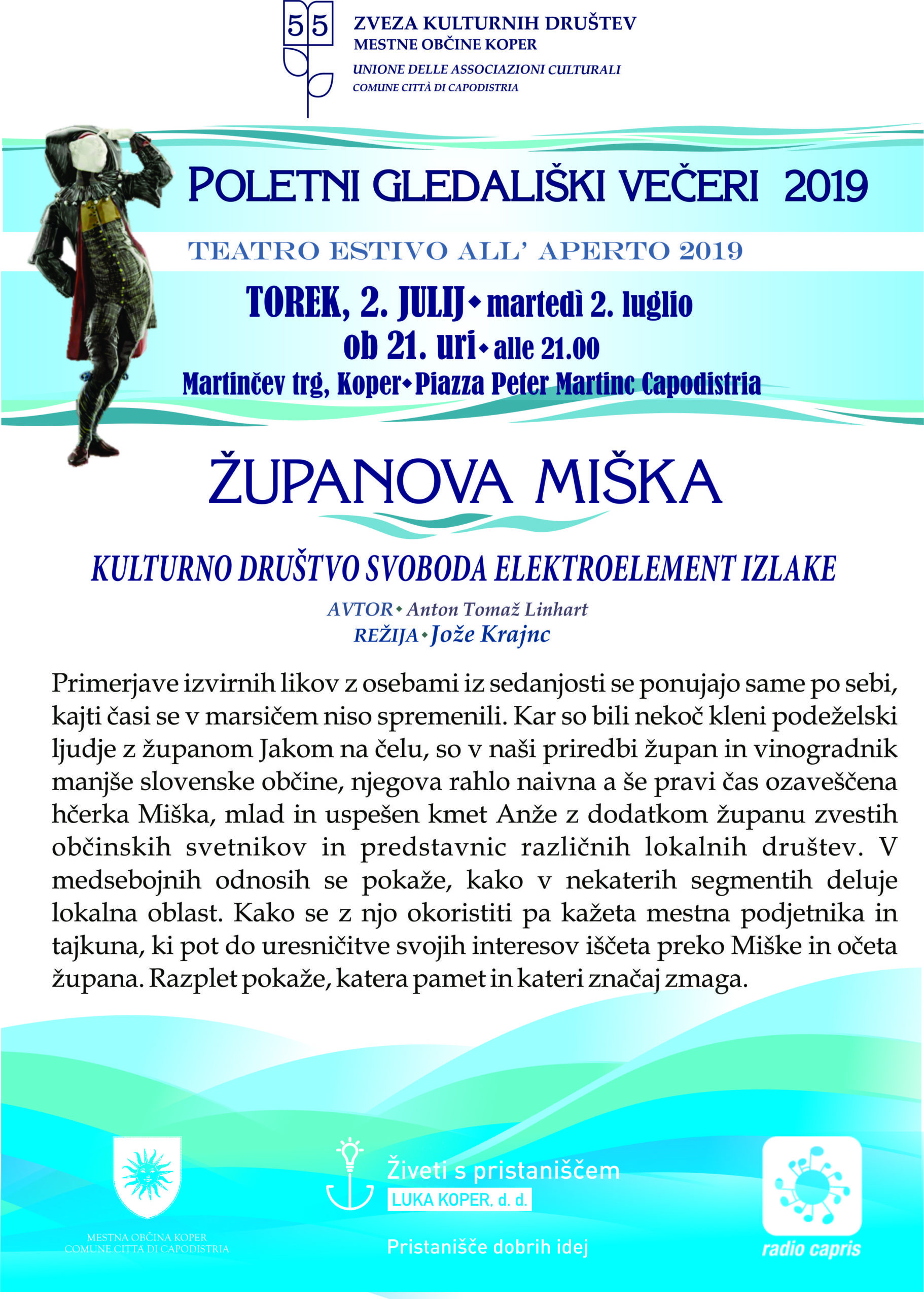 V torek, 2. julija 2019 ob 21.uri bo na Martinčevem trgu, v Kopru, nastopilo KD SVOBODA ELEKTROELEMENT IZLAKE, z gledališko predstavo Antona Tomaža Linharta ŽUPANOVA MIŠKA, v režiji: Jožeta Krajnca.Nakup vstopnice je možen na dan predstave, od 19:30 ure dalje na Martinčevem trgu.